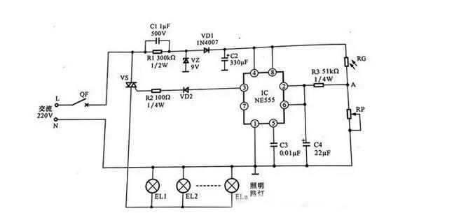 VD2导通后,触发晶闸管VS导通,照明路灯形成供电回路, EL1 ~ELn同时点亮。